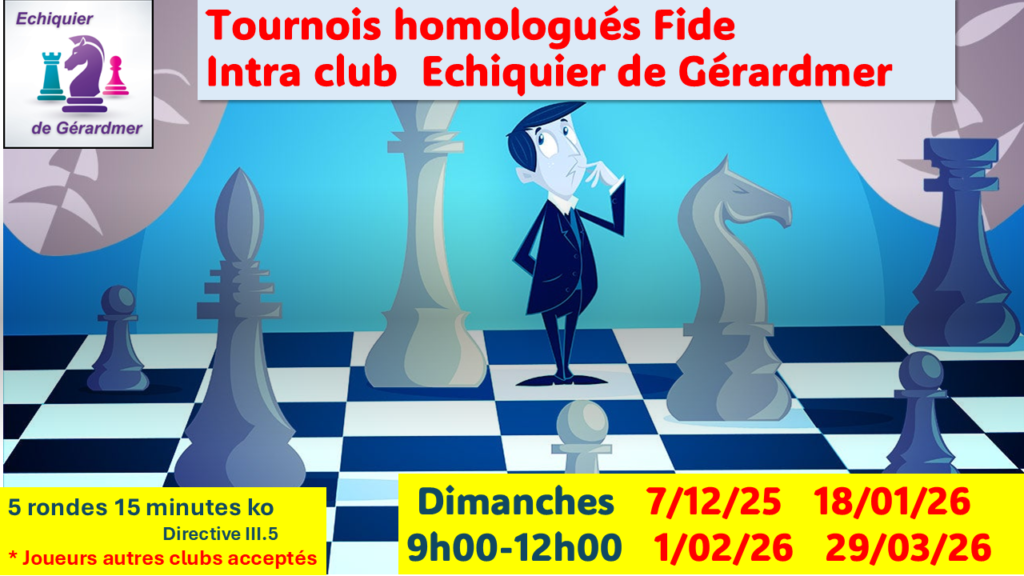Ces tournois sont prioritairement ouverts aux joueurs de l’Echiquier de Gérardmer mais des joueurs d’autres clubs seront acceptés dans la limite du nombre maximum de joueurs possible.